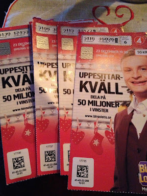 God kväll..och fjärde advent är de också. Har ni uppesittarkväll? Vann ni något på Bingolotten/lotterna? Vi vann ingenting, tror jag.. Ingen följer det utan man gör annat emellanåt.